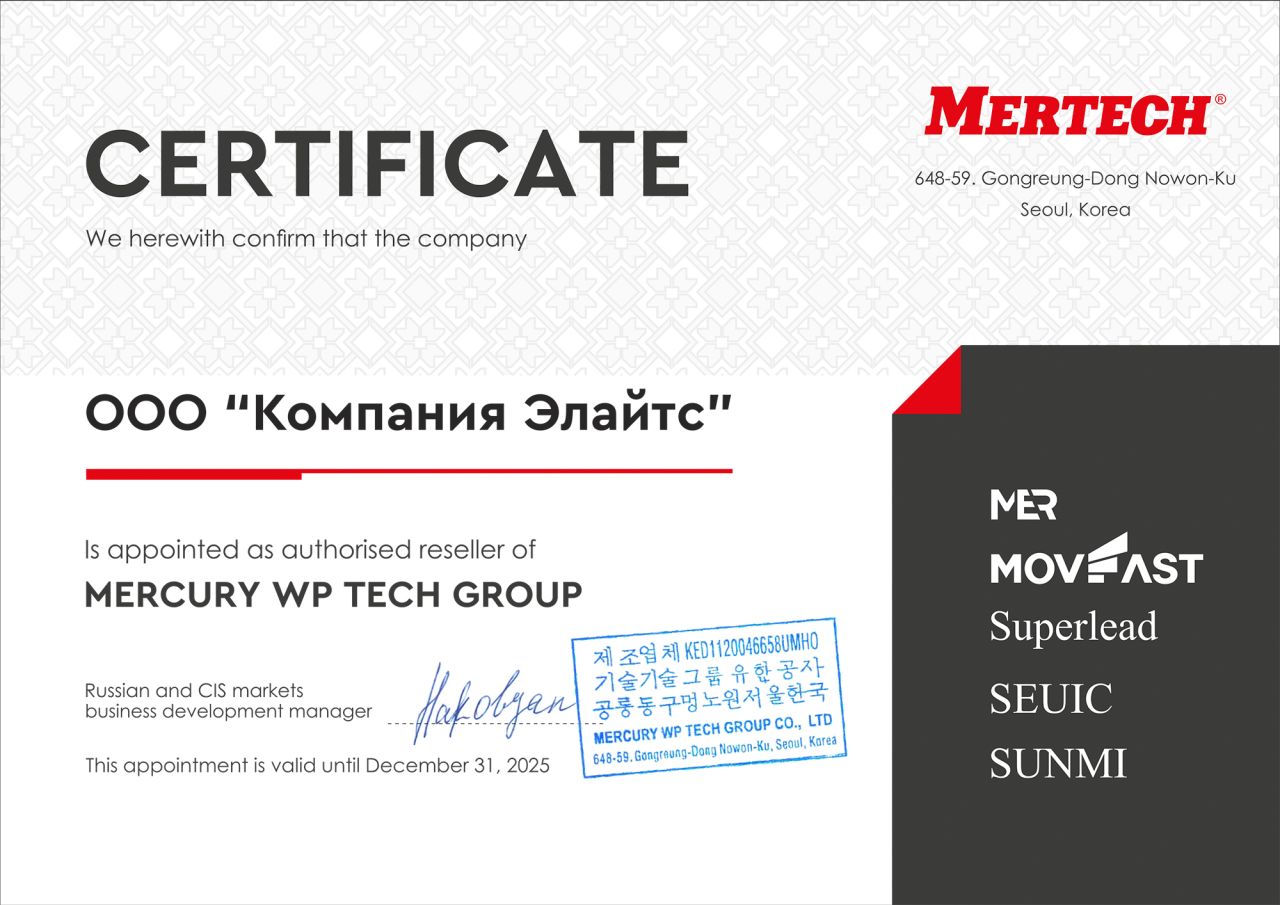 Элайтс является партнером таких компаний как Атол, Штрих, Дорс, Крафтвей и Гамма-Центр, а также полномочным дилером таких производителей как: Motorola, Honeywell, Posiflex, Zebra, Magner, Cas и Docash.